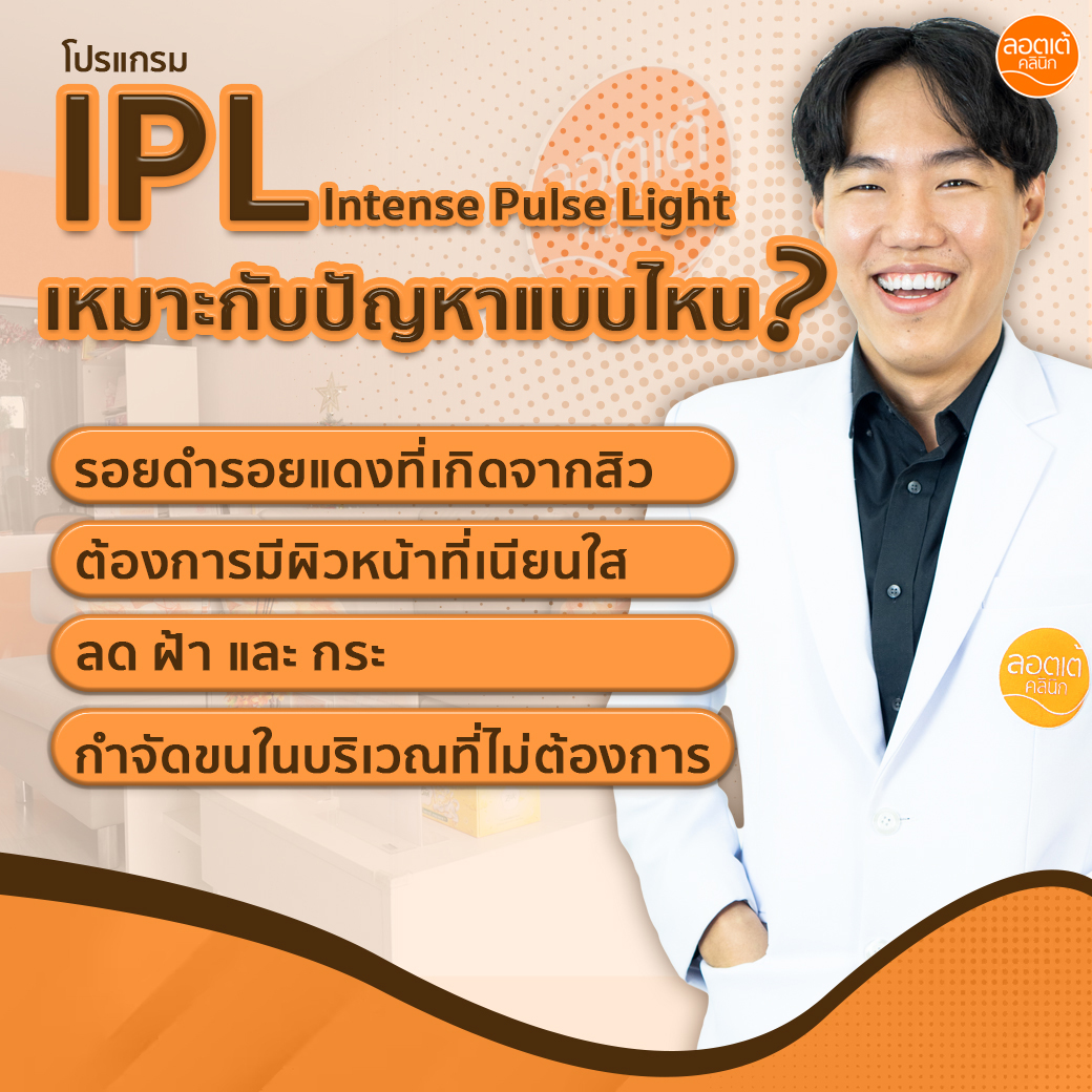 โปรแกรม IPL เป็นเทคโนโลยีที่ใช้คลื่นแสงยิงไปยังบริเวณที่ต้องการรักษาทั่วใบหน้า โดยตัวเครื่องโปรแกรม IPL จะเข้าไปกำจัดเม็ดสี และ เปลี่ยนเป็นพลังงานความร้อน ระหว่างทำอาจรู้สึกเจ็บเล็กน้อย เพราะโปรแกรม IPL จะเข้าไปทำปฏิกิริยาบนใบหน้าของเรา หลังจากทำโปรแกรม IPL เสร็จ จะรู้สึกได้เลยว่าผิวหน้าดูเรียบเนียนขึ้น รูขุมขนกระชับ ผิวหน้าดูอ่อนเยาว์มากขึ้น
