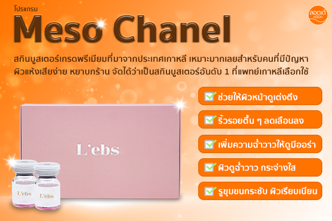 โปรแกรม เมโสชาเเนล (Meso Chanel) คือ การเพิ่มความชุ่มชื้นให้แก่ผิว จากผิวที่แห้งกร้านและหมองคล้ำ จะกลับมาใสฉ่ำวาว เปล่งปลั่งมีออร่า มีคุณสมบัติช่วยซ่อมแซมเซลล์ผิวที่เสื่อมสภาพ เพิ่มความอิ่มฟูให้ได้นานยิ่งขึ้น เป็น Skin Booster ที่กู้ผิวโทรมให้กลับมาสุขภาพดีได้ดีมาก ๆ เลยครับ