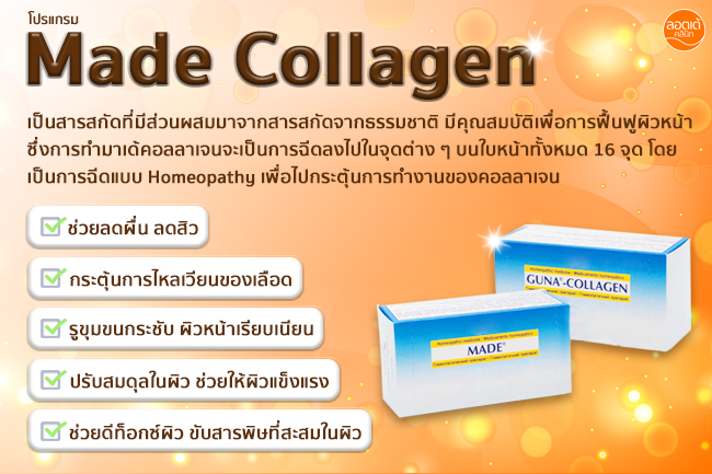 โปรแกรม มาด้ คอลลาเจน (Made Collagen) คือ การใช้ตัวยาที่มีคุณสมบัติในการกระตุ้นคอลลาเจนและวิตามินที่มีความสำคัญต่อผิว การฉีดมาเด้ คอลลาเจนทั้ง 16 จุด จะช่วยให้ผิวหน้ากระจ่างใส รูขุมขนกระชับ ลดผื่น ลดสิว เป็นการดีท็อกซ์สารพิษใต้ชั้นผิว บำรุงให้ผิวได้มีการซ่อมแซมและกลับมาแข็งแรงขึ้น แต่งหน้าติดทน ผิวเนียนละเอียด ฝ้า กระ จุดด่างดำลดเลือน