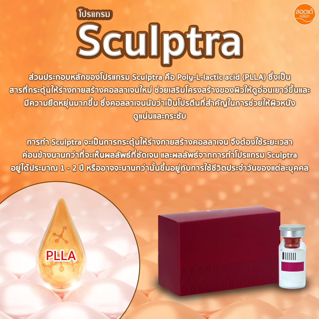 โปรแกรม Sculptra มี Poly-L-Lactic Acid (PLLA) เป็นส่วนประกอบหลัก ซึ่งเป็นสารที่ช่วยในการกระตุ้นการสร้างคอลลาเจน และได้รับการอนุมัติจาก FDA ของสหรัฐอเมริกา (FDA) จึงมีการใช้งานกันอย่างแพร่หลายทั่วโลก