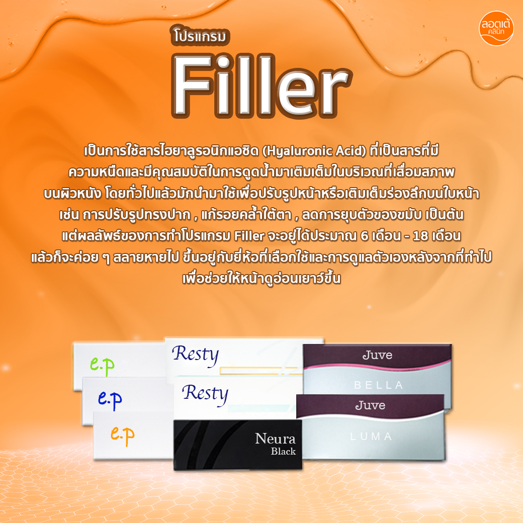 โปรแกรม Filler เป็นการใช้สารไฮยาลูรอนิกแอซิด (Hyaluronic Acid) มาเติมเต็มหรือปรับโครงสร้างใบหน้าให้ดูสมมาตร มีมิติ ดูอ่อนเยาว์ ดูอวบอิ่มมากขึ้น และยังช่วยลดริ้วรอยที่เป็นร่องลึกให้ตื้นขึ้น นิยมนำมาเติมบริเวณใต้ตา ร่องแก้ม ขมับ หรือบริเวณปาก และเป็นที่นิยมกันมากในคลินิกความงามทั่วประเทศ เพราะเป็นการทำที่เห็นผลลัพธ์ทันทีหลังจากทำเสร็จเลย แต่สามารถอยู่ได้ประมาณ 6 - 18 เดือน ขึ้นอยู่กับยี่ห้อของสารเติมเต็ม Hyaluronic Acid ที่ใช้และการดูแลตัวเองหลังทำไปด้วยครับ