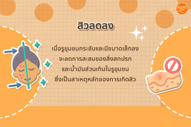 ลดการเกิดสิว : เมื่อรูขุมขนกระชับและมีขนาดเล็กลง จะช่วยลดการสะสมของสิ่งสกปรก ฝุ่นละออง และน้ำมันส่วนเกินในรูขุมขน ซึ่งเป็นสาเหตุสำคัญที่ทำให้เกิดสิวและการอุดตันต่างๆ บนผิวหน้า การมีรูขุมขนที่เล็กลงจึงส่งผลให้สิ่งสกปรกไม่สามารถเข้าไปฝังตัวในผิวได้ง่าย ช่วยให้ผิวหน้าดูสะอาดและสุขภาพดี นอกจากนี้ยังทำให้ผิวดูเรียบเนียนและกระจ่างใสขึ้นอีกด้วย ทำให้ลดโอกาสการเกิดสิวซ้ำซากและช่วยรักษาความชุ่มชื้นตามธรรมชาติของผิว