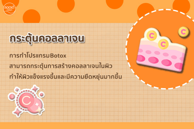 กระตุ้นการสร้างคอลลาเจน : การทำโปรแกรม Botox ไม่เพียงช่วยลดริ้วรอย แต่ยังมีส่วนช่วยกระตุ้นการสร้างคอลลาเจนในชั้นผิวอีกด้วย การเพิ่มขึ้นของคอลลาเจนทำให้โครงสร้างผิวแข็งแรงขึ้นและมีความยืดหยุ่นมากขึ้น ซึ่งช่วยให้ผิวสามารถรักษาความชุ่มชื้นได้ดี ลดการหย่อนคล้อยและการเกิดริ้วรอยใหม่ได้อย่างมีประสิทธิภาพ ผลลัพธ์ที่ได้คือผิวที่ดูอ่อนเยาว์และเรียบเนียนมากขึ้น ผิวหน้าจึงดูเต่งตึงและกระชับมากขึ้นตามธรรมชาติ