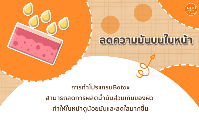 ลดความมันบนใบหน้า : การทำโปรแกรม Botox ช่วยลดการผลิตน้ำมันส่วนเกินในผิวโดยการยับยั้งการทำงานของต่อมไขมันบางส่วน ทำให้การผลิตน้ำมันลดลง ผิวหน้าจึงดูน้อยมันและสดใสขึ้น ซึ่งมีประโยชน์โดยเฉพาะสำหรับผู้ที่มีผิวมันและมักเผชิญปัญหาการสะสมของน้ำมันบนผิวหน้า ที่ก่อให้เกิดสิวอุดตันและผิวหมองคล้ำ การควบคุมน้ำมันด้วย Botox ช่วยให้ผิวมีความสมดุลและดูสุขภาพดีขึ้น ช่วยลดความมันวาวที่ไม่พึงประสงค์และทำให้การแต่งหน้าติดทนนานกว่าเดิม