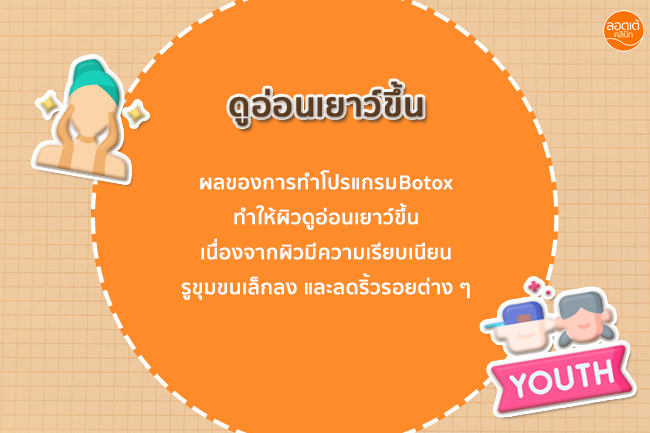 ดูอ่อนเยาว์ขึ้น : ผลจากการทำโปรแกรม Botox ทำให้ผิวดูอ่อนเยาว์ขึ้น โดยหลักการทำงานของ Botox จะช่วยลดริ้วรอยและรอยย่นบนผิวหน้าอย่างมีประสิทธิภาพ โดยเฉพาะบริเวณหน้าผาก รอบดวงตา และร่องแก้ม ทำให้ผิวดูเรียบเนียนมากขึ้น นอกจากนี้ Botox ยังช่วยกระชับรูขุมขน ซึ่งช่วยลดการสะสมของน้ำมันและสิ่งสกปรก จึงช่วยให้ผิวหน้าดูละเอียดและสม่ำเสมอมากขึ้น ผลที่ได้คือผิวหน้าดูสดใส ไร้ริ้วรอย ดูกระชับเต่งตึง ส่งผลให้ภาพรวมของผิวหน้าดูอ่อนกว่าวัยและมีความเปล่งปลั่ง
