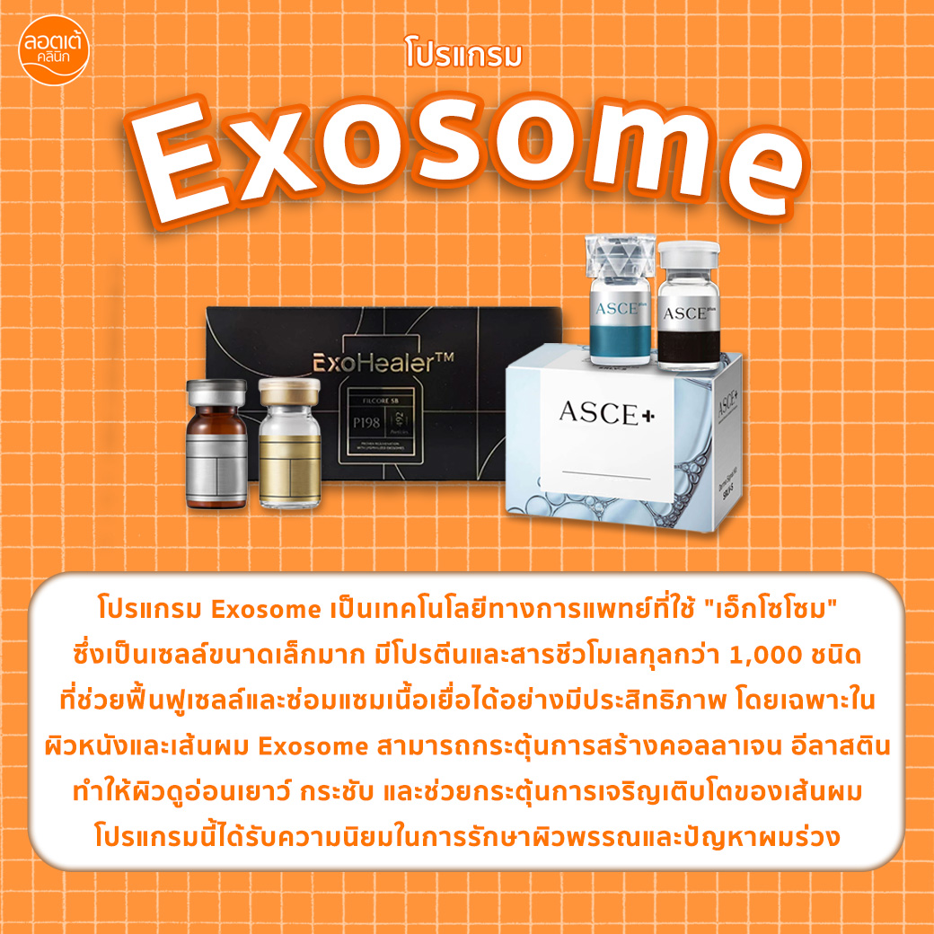 โปรแกรม Exosome เป็นเทคโนโลยีทางการแพทย์ที่มีองค์ประกอบของโปรตีนขนาดเล็กมาก โดยในเซลล์ที่เรียกว่า "เอ็กโซโซม" จะมีลักษณะเป็นวงกลมซึ่งมีขนาดเพียง 30 - 100 นาโนเมตร (nm) เล็กกว่าเซลล์ทั่วไปถึง 1/1,000 เท่า ภายในเซลล์ที่เรียกว่า "เอ็กโซโซม" จะประกอบไปด้วยสารชีวโมเลกุลมากมายกว่า 1,000 ชนิด เช่น Cytokines, Growth Factors, Micro RNA, และ Genetic Information รวมถึงโปรตีนอื่น ๆ ที่มากกว่าการทำโปรแกรมหน้าใสด้วยเกล็ดเลือดของตัวเอง (Platelet-Rich Plasma) ถึง 1,000 เท่า