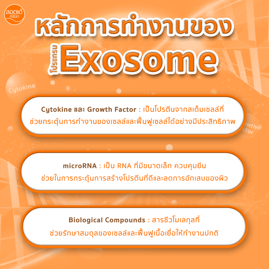 สรุปง่าย ๆ คือ Exosome ทำงานโดยการนำสารชีวโมเลกุลจากสเต็มเซลล์ไปฟื้นฟูและซ่อมแซมเซลล์ที่เสียหาย ปรับการทำงานของเซลล์ให้ดีขึ้น และช่วยรักษาสมดุลของเซลล์ในระดับลึก ทำให้เกิดการฟื้นฟูในระยะยาว