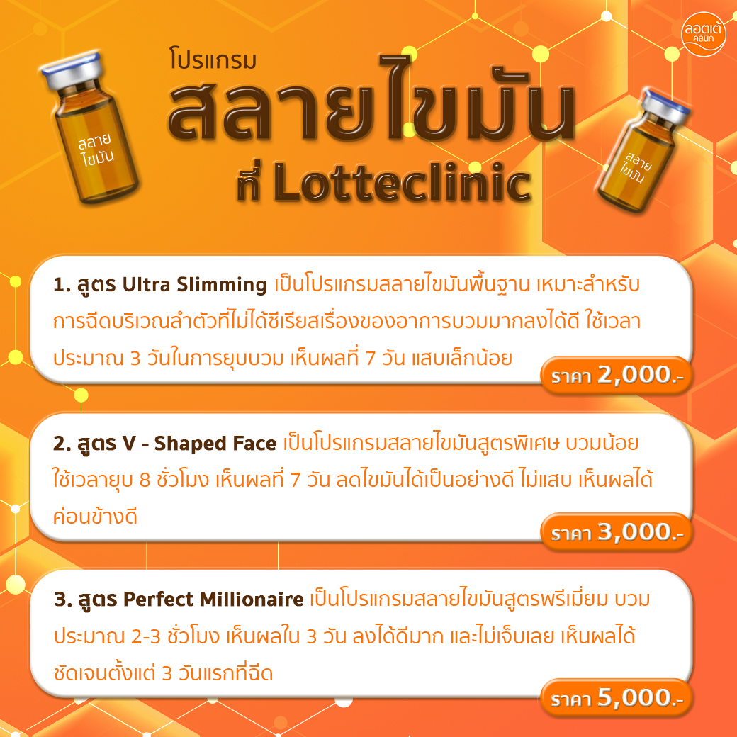 เคยไหมครับไม่ว่าจะออกกำลังกายหนักแค่ไหนกินคลีนยังไงแต่ไขมันส่วนเกินก็ยังคงสะสมอยู่เหมือนเดิมไม่ลดลงเลย แล้วถ้าจะให้ไปดูดไขมัน ใครหลาย ๆ คนก็คงจะยังกลัวเจ็บตัวและไม่มีเวลาพักฟื้น แต่ไม่ต้องท้อใจไปครับ เพราะที่ลอตเต้คลินิกเรามีวิธีแก้ปัญหานี้ให้กับทุก ๆ คน นั่นก็คือการทำโปรแกรมสลายไขมัน !