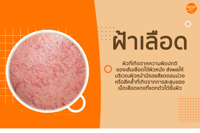ฝ้าเลือด : ปัญหาผิวที่เกิดจากความผิดปกติของเส้นเลือดใต้ผิวหนัง ส่งผลให้บริเวณผิวหน้ามีรอยสีแดงอมม่วง หรือสีคล้ำที่เกิดจากการสะสมของเม็ดเลือดแดงที่แตกตัวใต้ชั้นผิว ฝ้าเลือดมักพบในบริเวณโหนกแก้ม หน้าผาก หรือจุดที่โดนแสงแดดเป็นประจำ