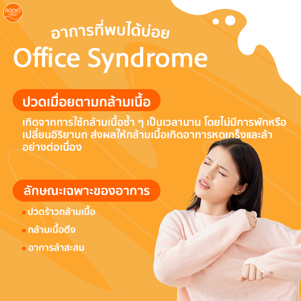 Office Syndrome เกิดจากการใช้งานกล้ามเนื้อเดิมซ้ำ ๆ เป็นเวลานาน เช่น นั่งทำงานท่าเดิมต่อเนื่องหลายชั่วโมง ส่งผลให้กล้ามเนื้อเกิดการหดเกร็งและอาการปวดลามไปยังส่วนต่าง ๆ หากปล่อยไว้นาน อาการเหล่านี้อาจกลายเป็นปัญหาเรื้อรังได้