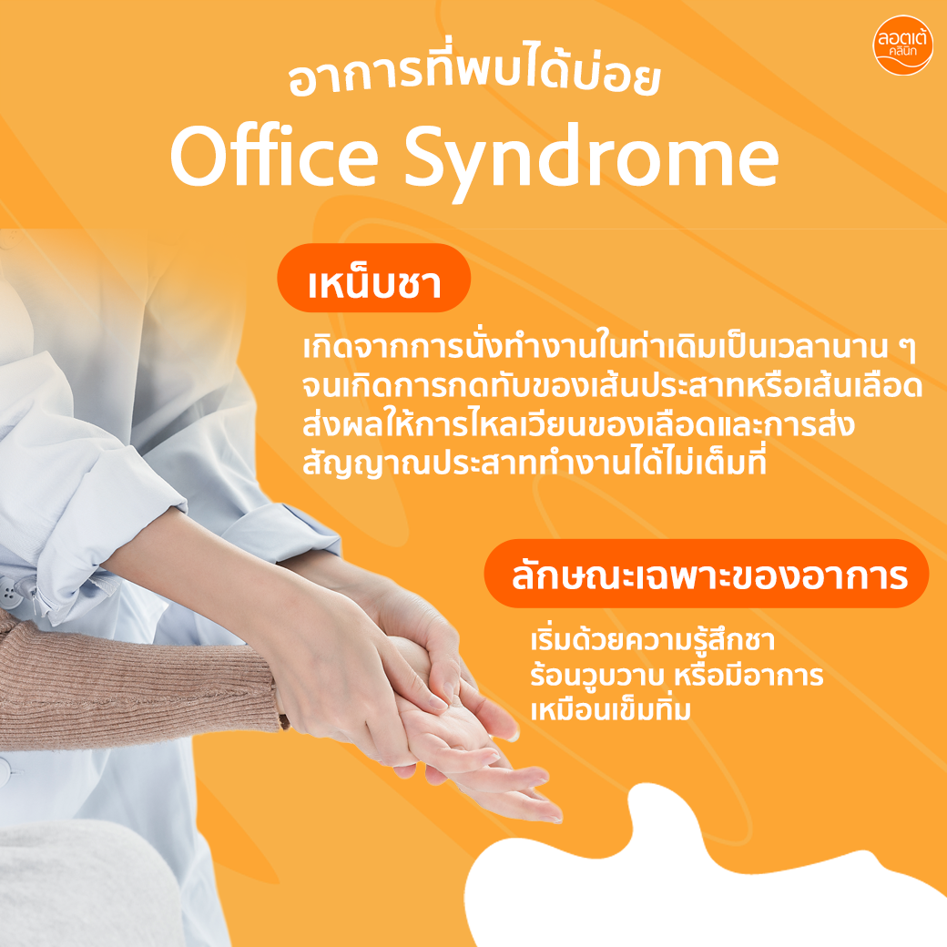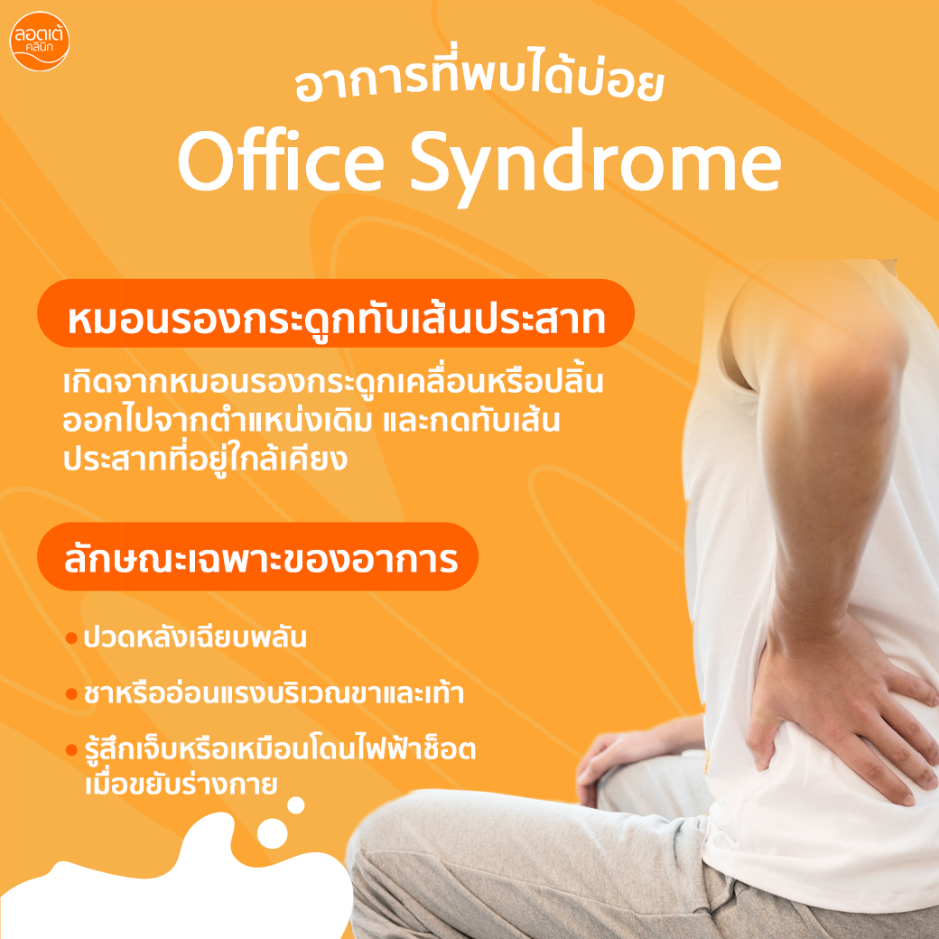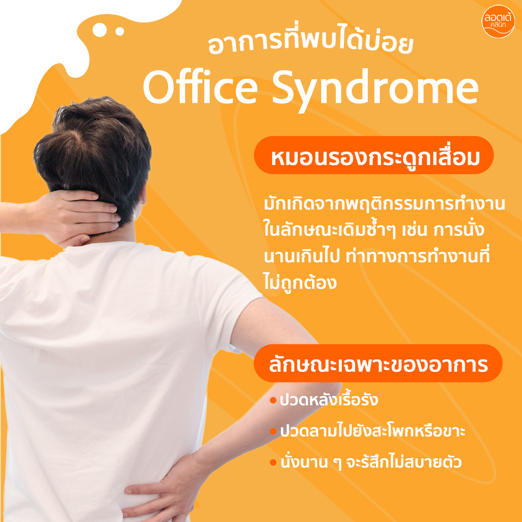 หมอนรองกระดูกเสื่อม , หมอนรองกระดูกทับเส้นประสาท : เป็นอาการที่พบได้บ่อยในกลุ่มคนที่มีภาวะ Office Syndrome ซึ่งมักเกิดจากพฤติกรรมการทำงานในลักษณะเดิมซ้ำๆ เช่น การนั่งนานเกินไป ท่าทางการทำงานที่ไม่ถูกต้อง และการขาดการออกกำลังกาย ส่งผลต่อระบบกระดูกและกล้ามเนื้อโดยรวม