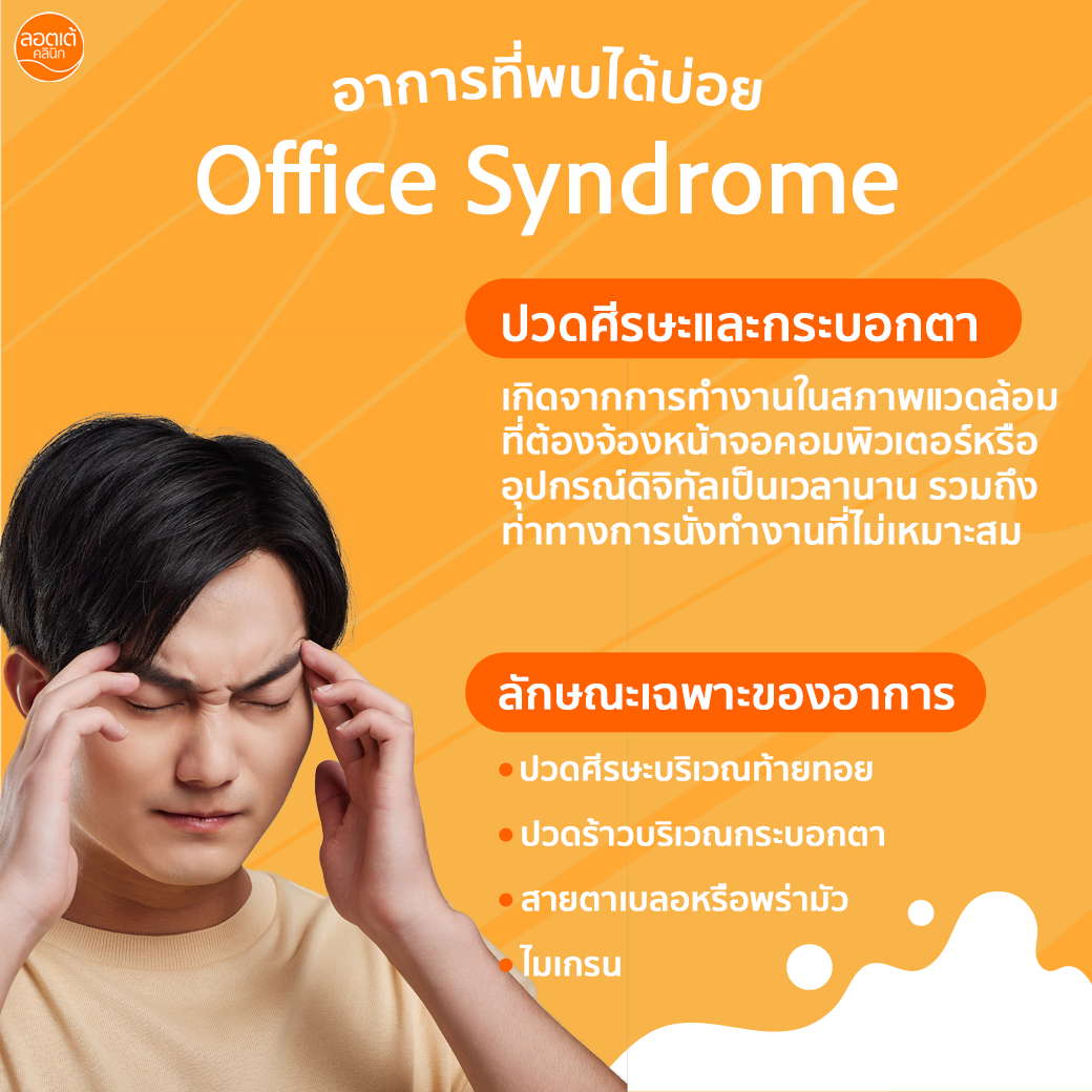 ปวดศีรษะและกระบอกตา : พบได้บ่อยในผู้ที่ทำงานในออฟฟิศ โดยเฉพาะกลุ่มที่ต้องใช้สายตาจ้องจอคอมพิวเตอร์หรืออุปกรณ์ดิจิทัลเป็นเวลานาน รวมถึงผู้ที่มีท่าทางการนั่งทำงานที่ไม่เหมาะสม ซึ่งส่งผลต่อระบบกล้ามเนื้อและการไหลเวียนเลือดโดยตรง