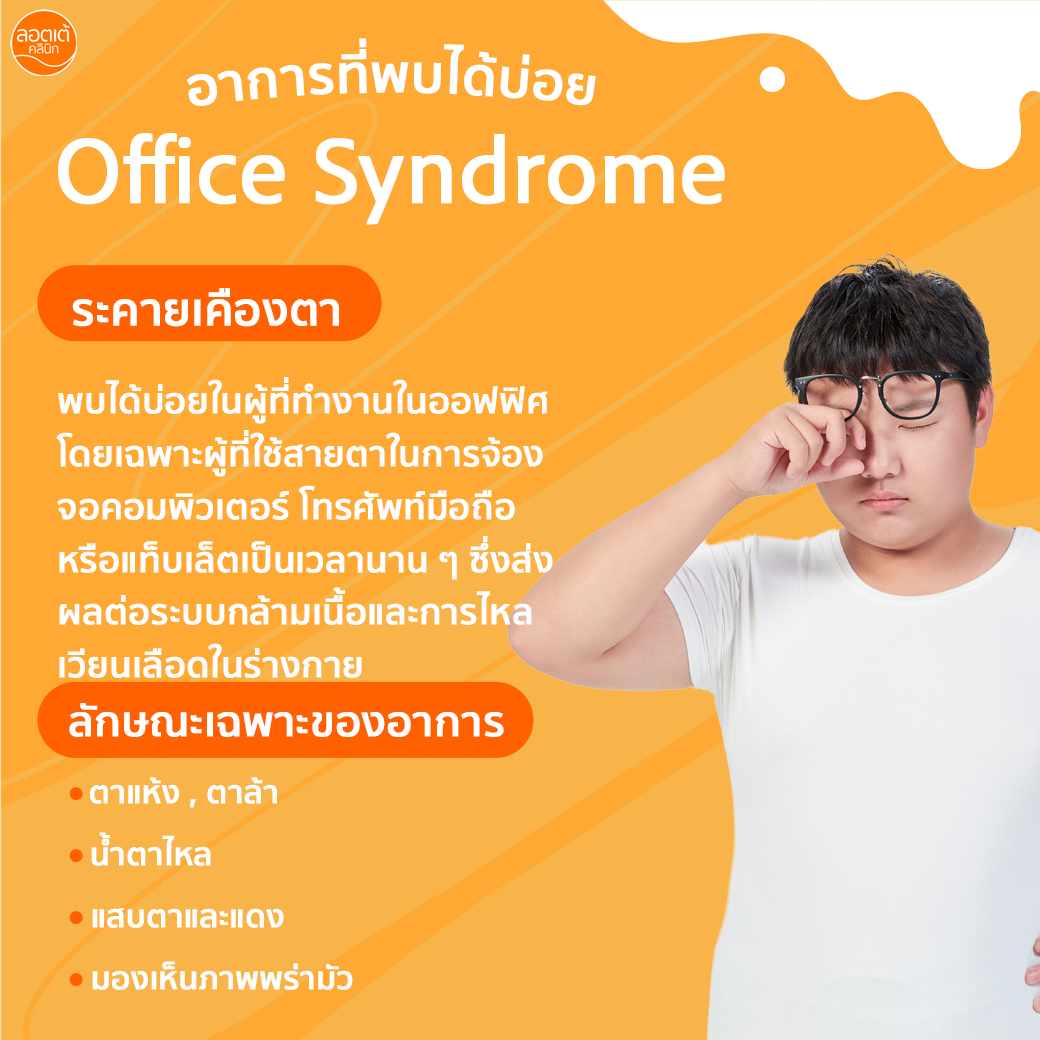 อาการระคายเคืองตา : พบได้บ่อยในผู้ที่ทำงานในออฟฟิศ โดยเฉพาะผู้ที่ใช้สายตาในการจ้องจอคอมพิวเตอร์ โทรศัพท์มือถือ หรือแท็บเล็ตเป็นเวลานาน ๆ อาการนี้ไม่ได้เกิดจากดวงตาเพียงอย่างเดียว แต่ยังเกี่ยวข้องกับท่าทางการทำงานที่ไม่เหมาะสม ซึ่งส่งผลต่อระบบกล้ามเนื้อและการไหลเวียนเลือดในร่างกาย