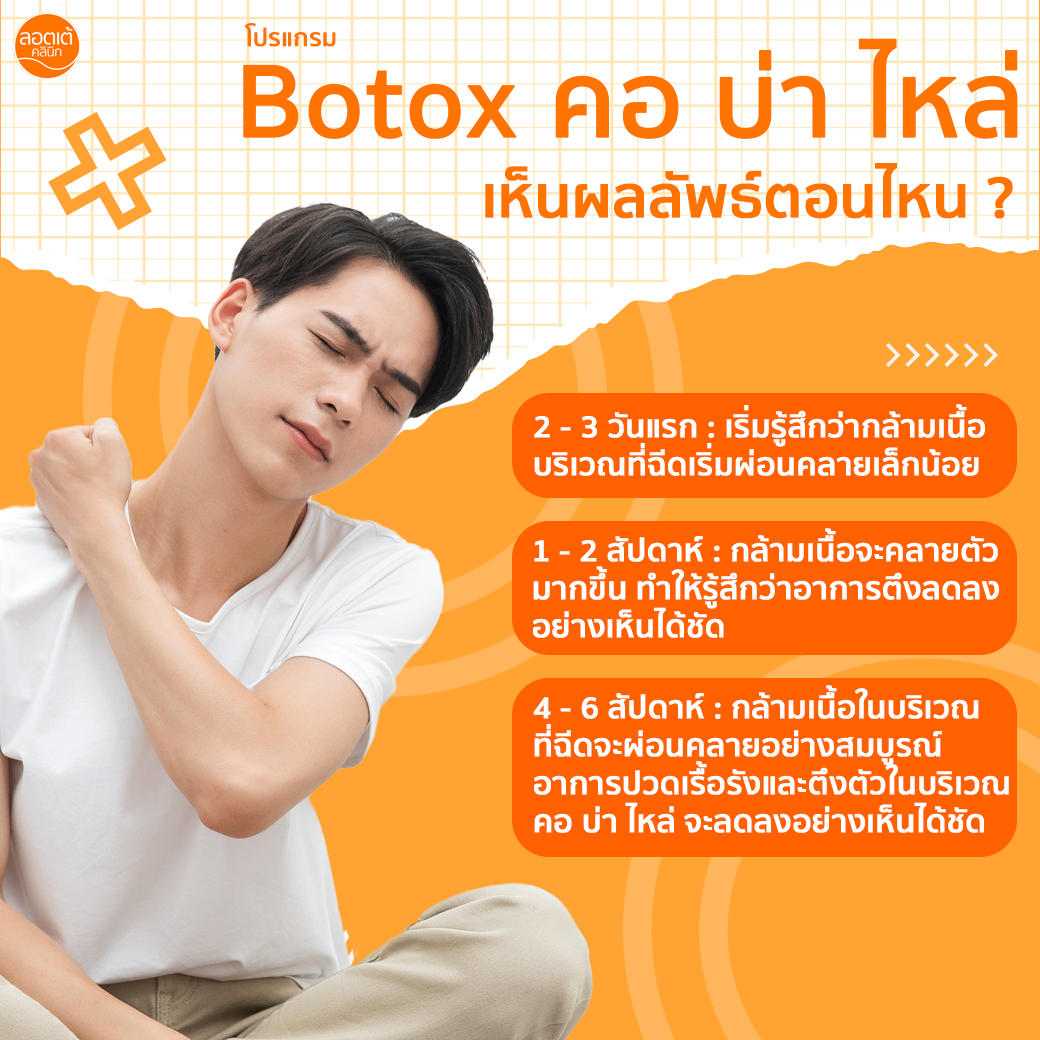หลังจากทำ โปรแกรม Botox ที่บริเวณคอ บ่า และไหล่ ผลลัพธ์จะเริ่มปรากฏในช่วงเวลาที่แตกต่างกันไปตามแต่ละบุคคล โดยทั่วไปมีรายละเอียดดังนี้: