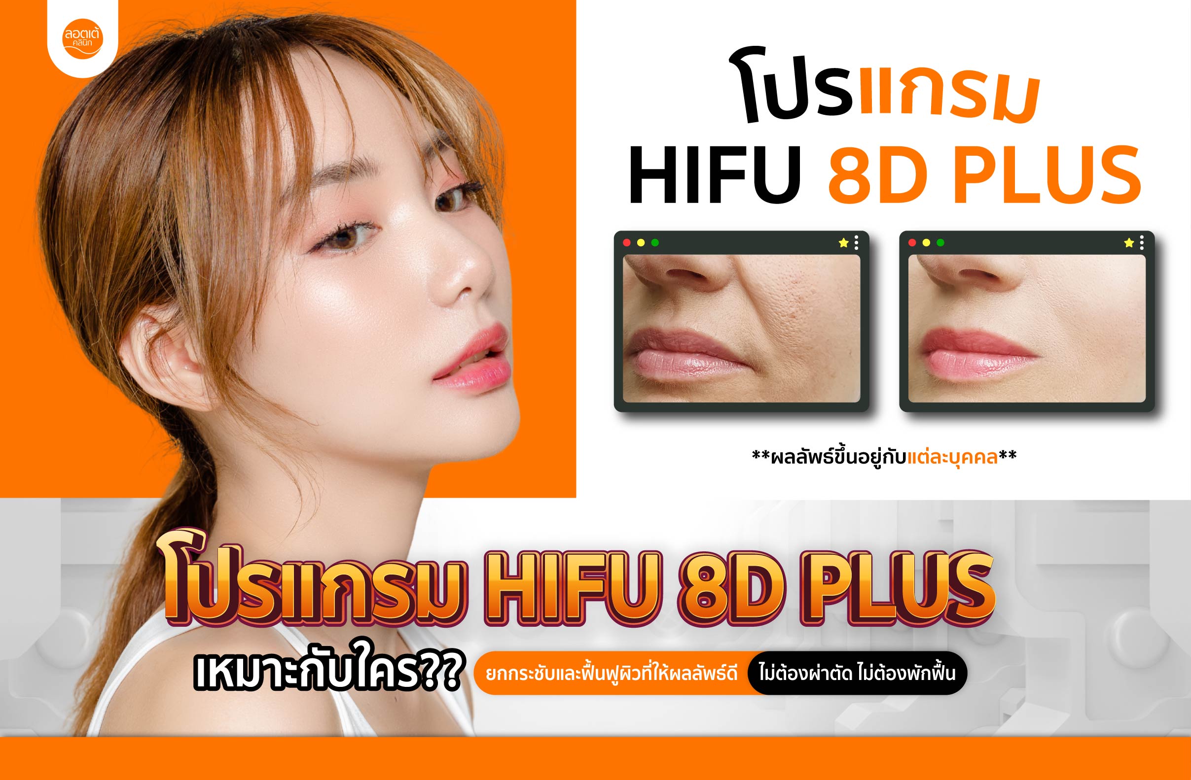โปรแกรม HIFU 8D Plus จึงเหมาะกับคนที่อายุยังไม่มาก หรือมีปัญหาผิวย่อนคล้อยเล็กน้อย ต้องการให้ผิวดูเฟิร์มขึ้น แต่ยังไม่ต้องการผลลัพธ์ที่ดูเปลี่ยนแปลงมากจนเกินไป และข้อดีอีกอย่างก็ คือ โปรแกรม HIFU 8D Plus มีราคาที่ย่อมเยากว่า สามารถทำได้บ่อยตามความต้องการ โดยผลลัพธ์ของโปรแกรม HIFU 8D Plus จะอยู่ได้นานประมาณ 4 - 6 เดือน และสามารถทำซ้ำได้ทุก 3 - 6 เดือนเพื่อคงผลลัพธ์