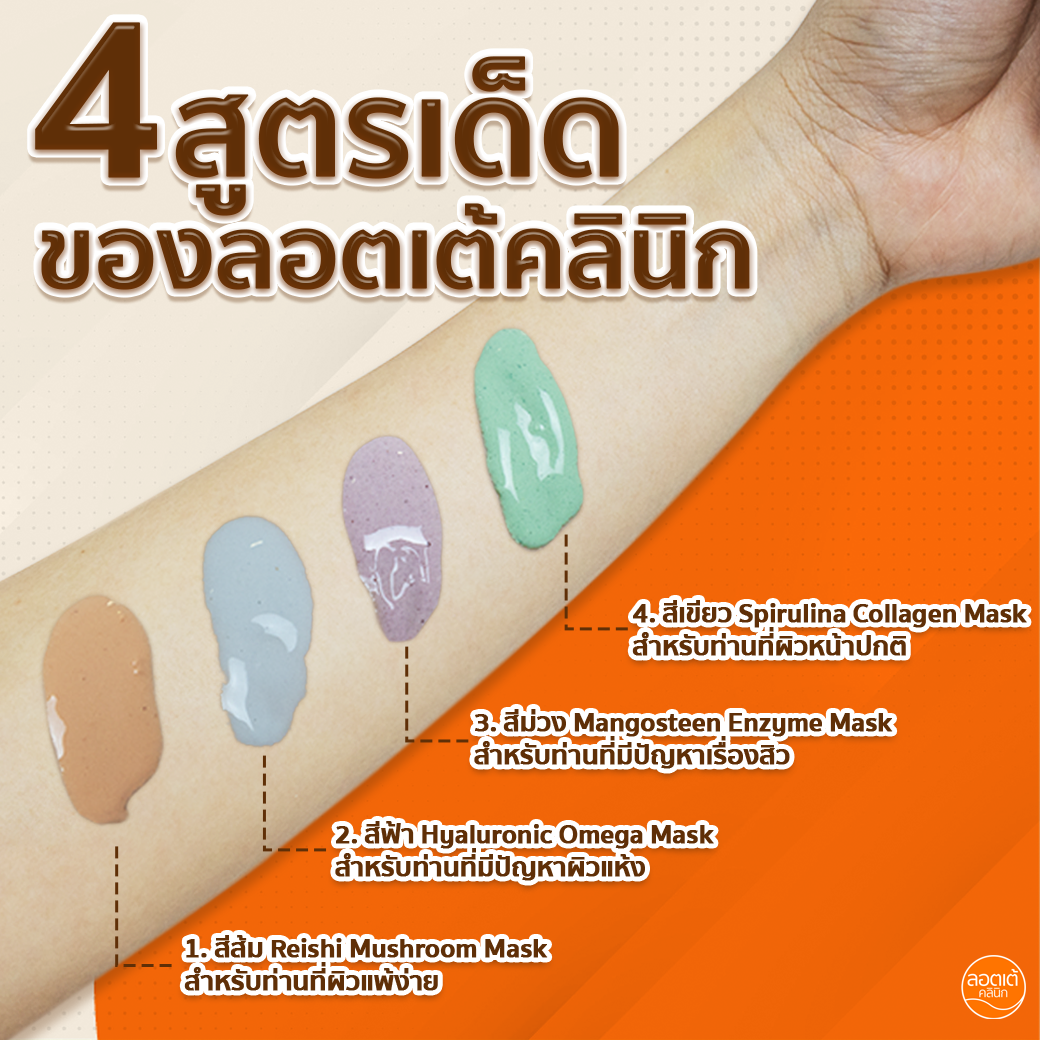 เพื่อให้การทำงานของวิตามิน ตรงกับสภาพผิวมากที่สุด ที่ลอตเต้คลินิก เรามีมาส์กให้เลือกถึง 4 แบบ แล้วแต่สภาพผิวของแต่ละท่าน ประกอบไปด้วย