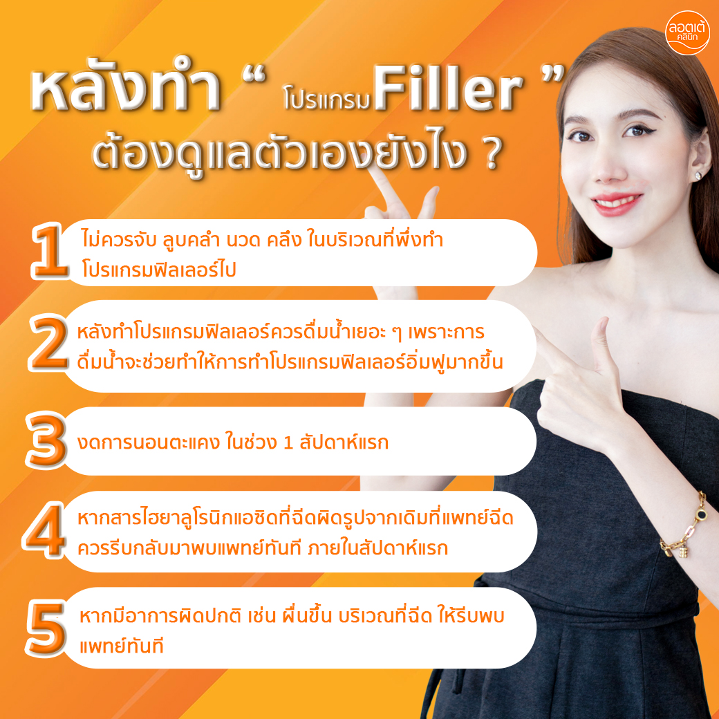 1. หลังทำโปรแกรมฟิลเลอร์ ห้ามกด จับ หรือนวดบริเวณที่ฉีดแรง ๆ เพราะจะทำให้สารไฮยาลูโรนิกแอดซิดเปลี่ยนรูป และไม่เป็นรูปทรงที่ต้องการ ถ้าจำเป็นต้องสัมผัสให้พยายามสัมผัสบริเวณที่ทำเบา ๆ ในช่วง 2 สัปดาห์แรก