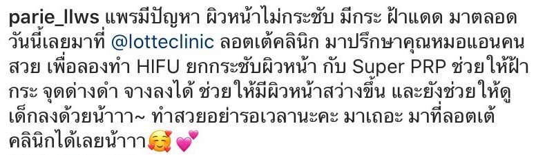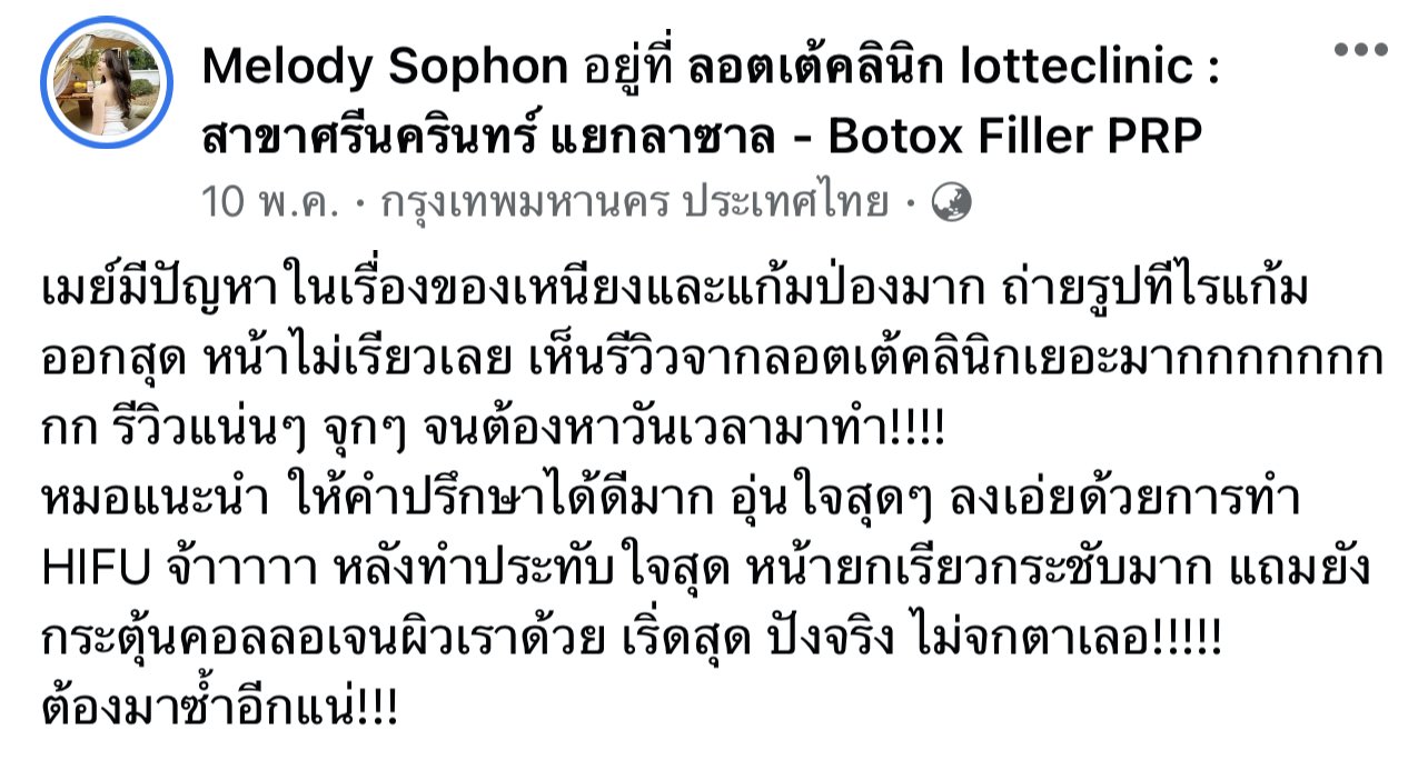 ที่ลอตเต้คลินิก เราทำ HIFU 8D Plus ให้เทียบทีละข้าง เพื่อให้สังเกตผลลัพธ์ให้ชัดเจนที่สุด และยิงให้จนกว่าจะรู้สึกพอใจ ซึ่งโดยปกติหลังทำทันทีจะเห็นผลประมาณ 30 - 40% และจะเห็นผลลัพธ์แบบเต็มที่ 2 สัปดาห์หลังจากที่ทำไป