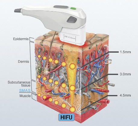 เป็นหัวที่ถูกออกแบบมาเพื่อส่งคลื่นเสียงอัลตราซาวด์ลงไปในชั้นผิวที่ลึกที่สุด ซึ่งก็คือชั้น SMAS (Superficial Muscular Aponeurotic System) ที่อยู่ลึกประมาณ 4.5 มม. ใต้ผิวหนัง จะช่วยให้เกิดการยกกระชับและฟื้นฟูโครงสร้างผิวจากภายใน ทำให้ใบหน้าได้รูปและดูอ่อนเยาว์ขึ้น