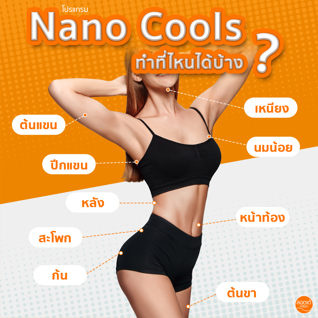 โปรแกรม Nano cools เป็นการสลายไขมันเฉพาะจุด กำจัดสัดส่วนเกิน เปรียบเทียบคล้าย ๆ กับการดูดไขมัน เป็นเทคโนโลยีใหม่ที่ใช้เอาอุณหภูมิที่ต่ำมาก เพื่อทำลายเซลล์ไขมันให้หายไปจากบริเวณที่เราต้องการ