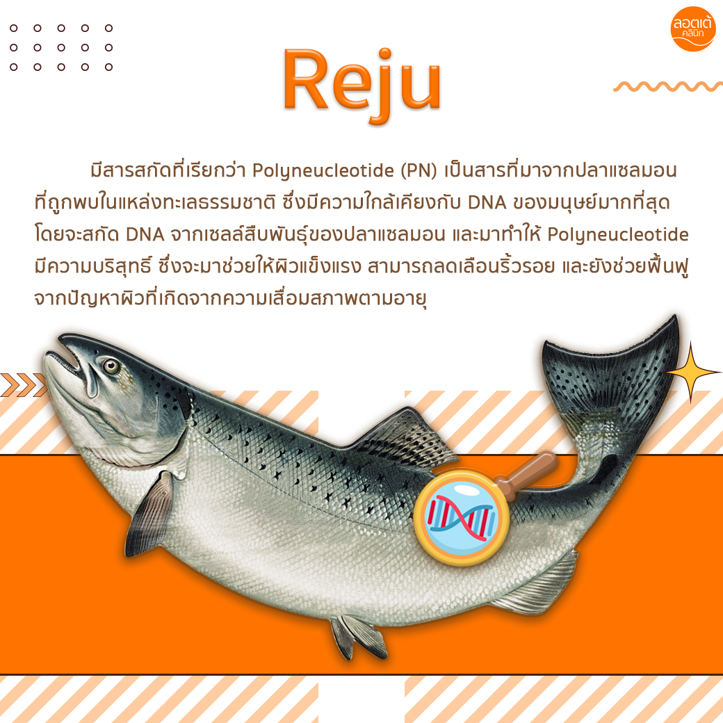โปรแกรม Reju ( รีจู ) คือ Skin Rejuvenation Booster ที่จะไปซ่อมเซลล์ผิวเก่า กระตุ้นการเกิดเซลล์ผิวใหม่ ตัวรีจู มีสารสกัดที่เรียกว่า Polyneucleotide (PN) ซึ่งเป็นสารที่มาจากปลาแซลมอนที่ถูกพบในแหล่งทะเลธรรมชาติ ซึ่งมีความใกล้เคียงกับ DNA ของมนุษย์มากที่สุด โดยจะสกัด DNA จากเซลล์สืบพันธุ์ของตัวปลาแซลมอน เมื่อนำมาเข้าสู่กระบวนการทำที่ให้ Polyneucleotide มีความบริสุทธิ์ แอนติเจนหรือโปรตีนที่อาจส่งผลต่อภูมิคุ้มกันในร่างกายก็จะถูกกำจัดไป จึงปลอดภัยหายห่วงครับ