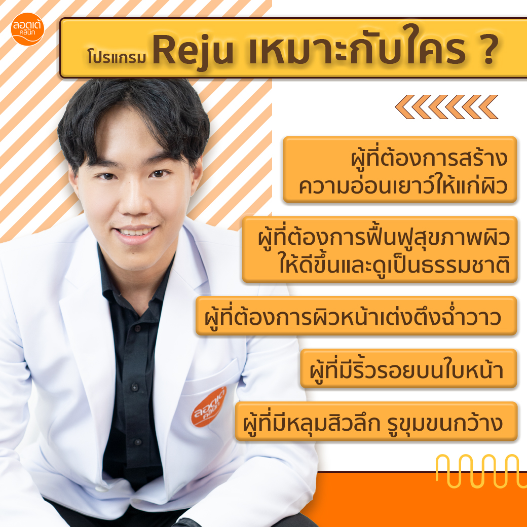 การทำโปรแกรม Reju จะคล้าย ๆ การทำโปรแกรมเมโส แต่การทำโปรแกรม Reju จะทำบริเวณที่เป็นรูขุมขนถี่ ๆ เว้นห่างกันไม่มาก ในขั้นตอนการฉีดจะเจ็บเล็กน้อย ซึ่งข้อดีของการทำโปรแกรม Reju คือจะใช้เข็มขนาดเล็ก ที่มีความบางเฉียบ ช่วยให้สารมีความหนืดปล่อยผ่านเข็มได้ง่าย ทำให้สารสามารถแทรกซึมเข้าสู่ชั้นผิวได้อย่างมีประสิทธิภาพ และช่วยลดความเจ็บลงได้ และไม่ทิ้งรอยแผลหลังจากการฉีดครับ