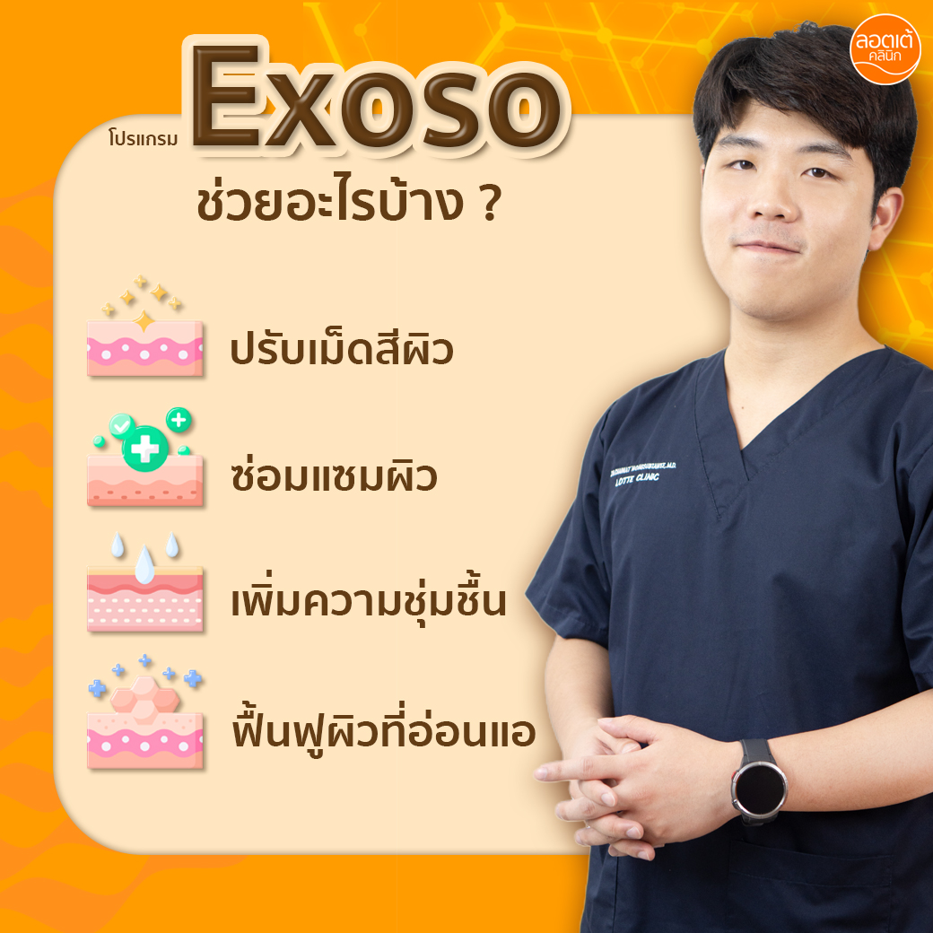 สำหรับหนุ่ม ๆ สาว ๆ คนไหนที่อยากฟื้นฟูสภาพผิวให้กลับมากระจ่างใส ดูชุ่มชื้นแบบเร่งด่วน แอดขอแนะนำโปรแกรม Exoso เลย เพราะตอบโจทย์และเห็นผลหลังทำไว เพื่อจะให้ได้ผลลัพธ์ที่ดีที่สุดควรเข้ามาปรึกษาคุณหมอก่อนนะครับ และสำหรับใครที่สนใจแต่ยังมองหา