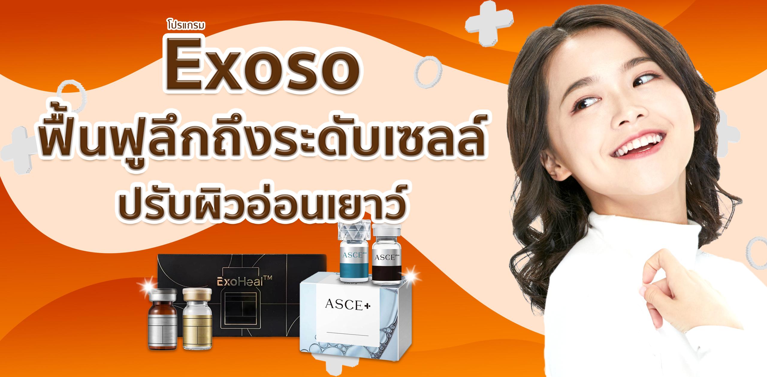 โปรแกรม Exoso คือ นวัตกรรมแบบใหม่แบบสับที่สามารถฟื้นฟูผิวได้ดี เพราะเป็นสารที่มีขนาดเล็กกว่าฝุ่น PM 2.5 เป็นสารที่ปล่อยออกมาจาก Stem Cell ด้วยขนาดเพียงแค่ 30 - 100 nm ซึ่งมีขนาดที่เล็กกว่าเซลล์ทั่วไปถึง 1,000 เท่า