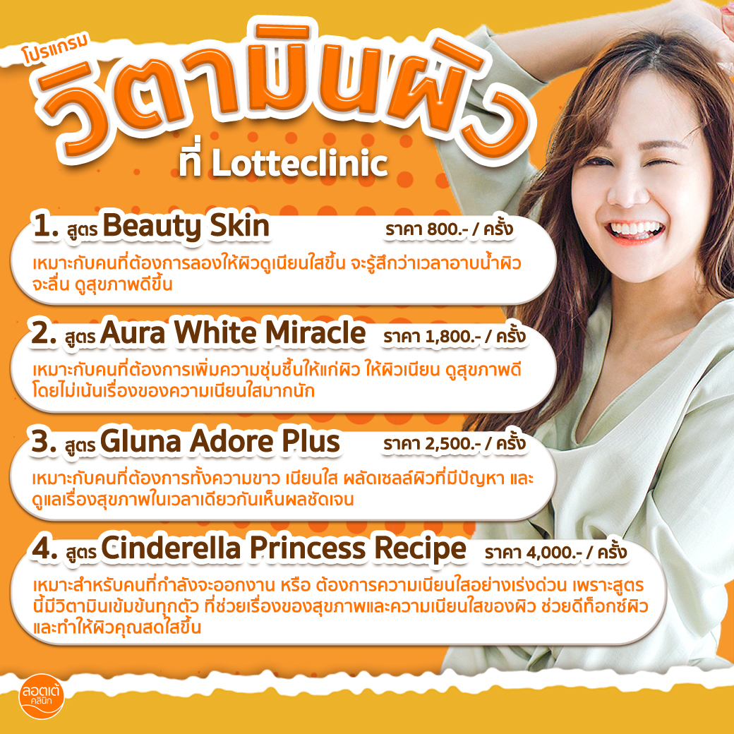 ที่ลอตเต้คลินิก เรามีวิตามินบำรุงผิวนานาชนิด ซึ่งประกอบไปด้วย วิตามินซี วิตามินอี วิตามิน บี คอลลาเจน โคเอนไซม์ และแร่ธาตุต่าง ๆ ที่ช่วยให้ร่างกายผลิตเม็ดสีเมลานินน้อยลง ทำให้ผิวเนียนใส ลื่น สุขภาพดีขึ้นตั้งแต่ครั้งแรกที่ทำ ปัจจุบันที่ลอตเต้คลินิก มีวิตามินผิวใสทั้งหมด 4 สูตร แตกต่างกันที่ความเข้มข้นและตัวยาของแต่ละสูตร ให้ท่านได้เลือกใช้ภายใต้คำแนะนำของแพทย์ โดยมีรายละเอียดดังนี้